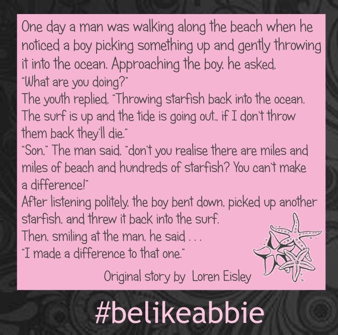 6 replies on “My Wish is to Make a Difference….If I am the boy, maybe you could be the starfish?”